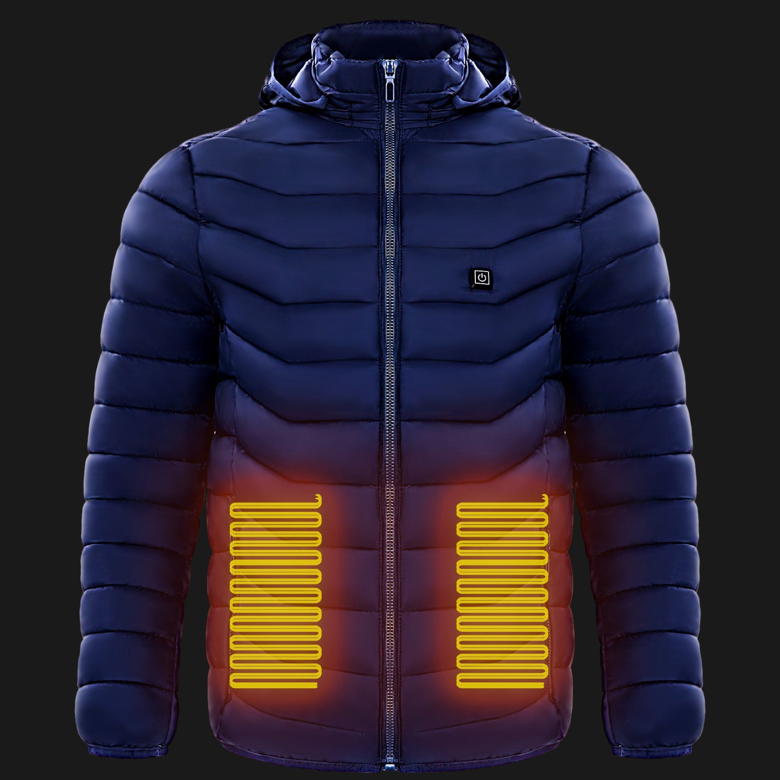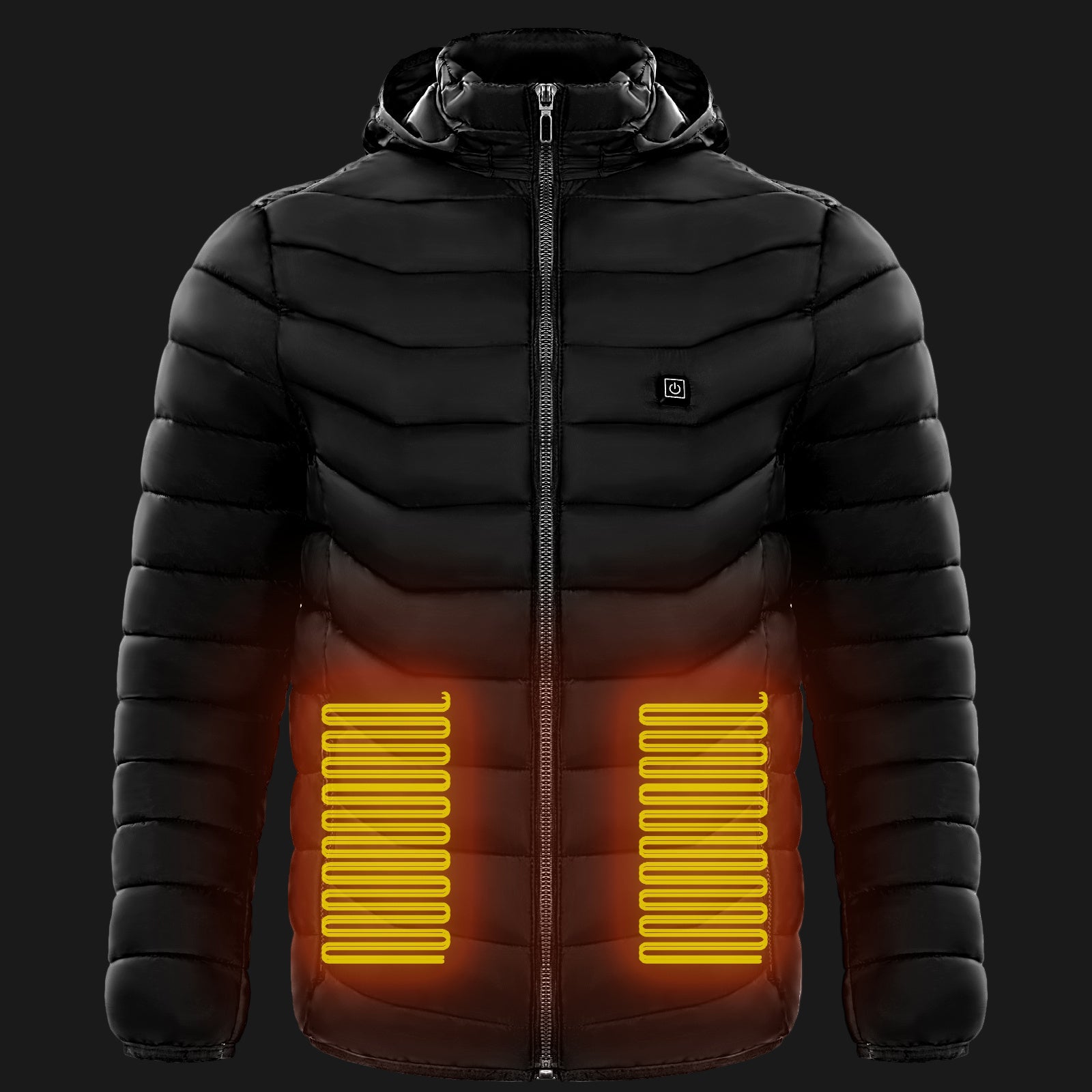 Our jacket uses advanced carbon fiber heating elements that generate heat across your core areas. Just plug in any 10,000mAh+ USB power bank and press the chest button to choose from 3 heat settings — warm, medium, or hot. It warms up in seconds and stays heated for up to 8–12 hours on a full charge.